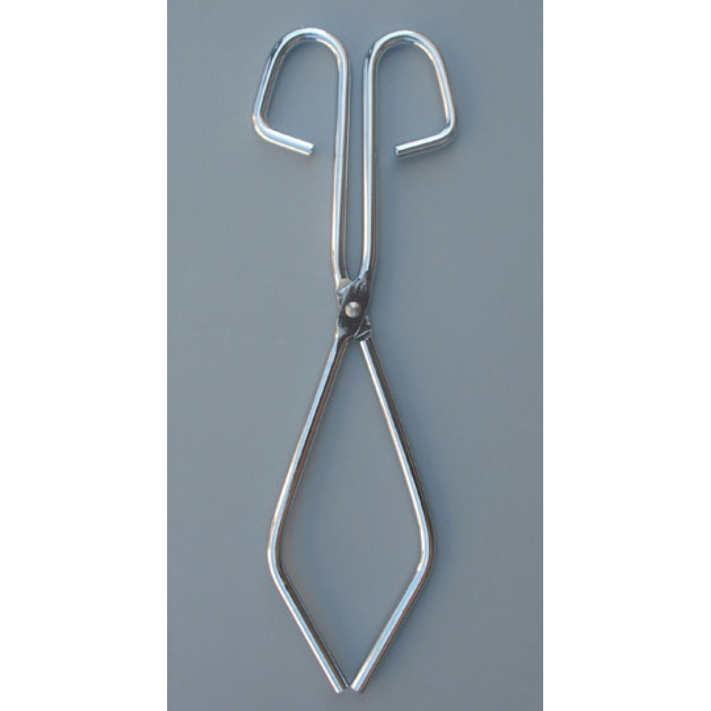 Long, nickel-plated tongs for safe beaker handling.