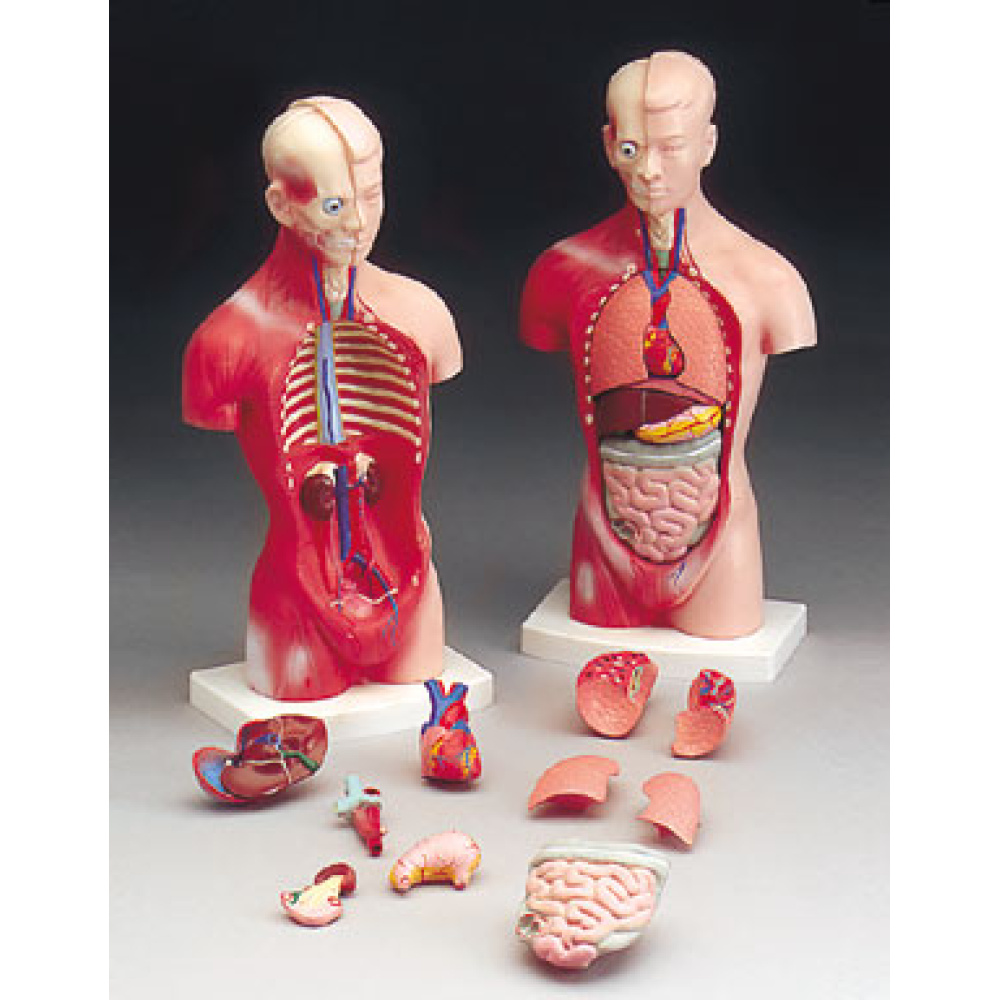 Features Male Torso Model With Musculature On One Side And Surface Skin On The Other. Dissects Into 15 Parts: Torso, Posterior Section Of The Head, Brain (2 Parts), Trachea, Lungs (4 Parts), Heart, Liver, Stomach, Intestine, And Kidney With Pancreas. Mounted On A Plastic Base.