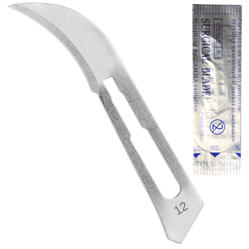 The Surgical Blade No.12 is a curved blade made of carbon steel, commonly used in educational settings for anatomical dissections and lab training. It is sterilized for safe handling and compatible with standard No. 3 and 3L blade handles. With a weight of 12 grams, this surgical instrument is for precise cutting techniques and handling of curved tissue sections.